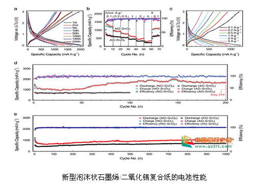 (中國粉體技術(shù)網(wǎng)/班建偉)近日,合肥工業(yè)大學(xué)化學(xué)與化工學(xué)院“黃山青年學(xué)者”從懷萍教授科研團(tuán)隊利用石墨烯納米片的二維宏觀組裝成功研制了一種新型泡沫狀石墨烯/二氧化錫復(fù)合紙,實現(xiàn)了微觀上相互交聯(lián)的微/納米泡沫孔洞結(jié)構(gòu)和宏觀上完整的薄膜結(jié)構(gòu)的平衡設(shè)計,克服了緊密堆積的石墨烯結(jié)構(gòu)阻礙鋰離子傳輸和不能很好緩沖脫/嵌鋰過程中造成的體積變化的問題,也解決了過于疏松結(jié)構(gòu)造成的電化學(xué)穩(wěn)定性差和體積能量密度低的問題。