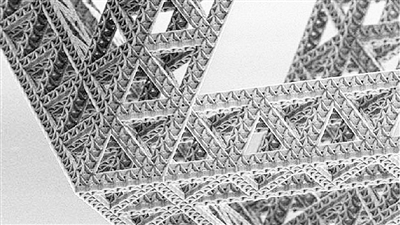 研究人員使用一種叫做雙光子光刻的激光直寫技術(shù),在一種高分子材料中“寫入”一個(gè)三維結(jié)構(gòu),即通過激光光束的照射讓高分子發(fā)生局部交聯(lián)硬化。被激光照射過的部分材料會(huì)保持結(jié)構(gòu)完整,而其他部分則會(huì)被溶解掉,只留下一個(gè)三維骨架。然后他們?cè)谶@個(gè)骨架上涂覆一層薄薄的材料——金屬、合金、玻璃、半導(dǎo)體等等,之后使用另一種方法將骨架中的高分子剝離出來,留下一個(gè)空心結(jié)構(gòu)。
