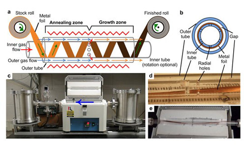 該新工藝采用了MIT及其他地方制備石墨烯使用的化學(xué)氣相沉積方法——使用一個在水平基板(如銅箔)上含有氣相碳反應(yīng)物的小真空室。該新體系采用類似的氣相化學(xué),但真空室由兩個同心管組成,薄的銅帶材基板平穩(wěn)的滑過內(nèi)管。