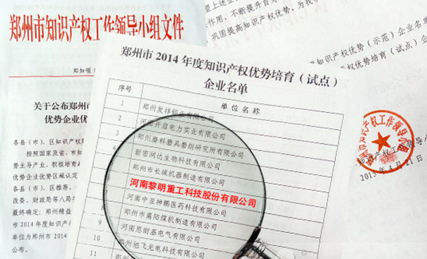 | 黎明重工被認(rèn)定為鄭州市“2014年度知識產(chǎn)權(quán)優(yōu)勢培育企業(yè)” |