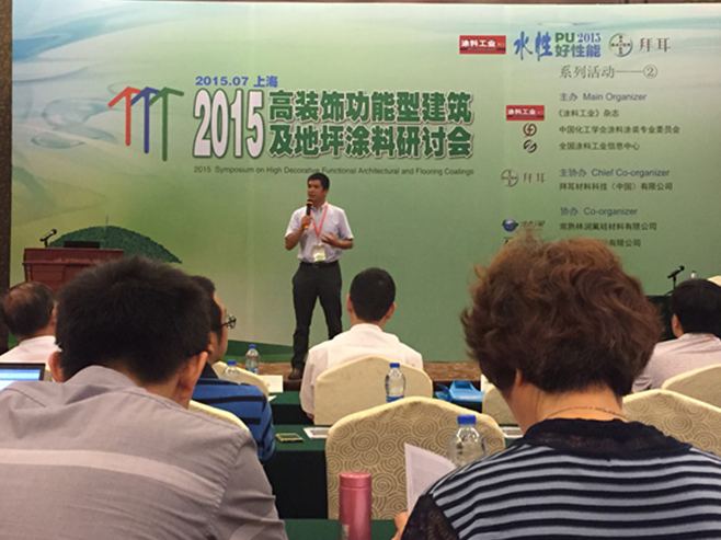 (中國(guó)粉體技術(shù)網(wǎng)/班建偉)2015年7月13日至16日,由中國(guó)化工學(xué)會(huì)涂料涂裝專業(yè)委員會(huì)、《涂料工業(yè)》雜志及全國(guó)涂料工業(yè)信息中心聯(lián)合主辦的2015年高裝飾功能型建筑及地坪涂料研討會(huì)在上海萬和亞隆國(guó)際大酒店舉行。此次會(huì)議是《涂料工業(yè)》和拜耳材料科技聯(lián)合舉辦的“水性好PU”系列活動(dòng)第二站。大會(huì)吸引了國(guó)內(nèi)外涂料上下游企業(yè)總計(jì)一百多名技術(shù)人員蒞臨參加。我公司派遣相關(guān)技術(shù)人員前往參會(huì),并在大會(huì)進(jìn)行技術(shù)宣講。