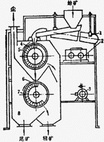 用于細(xì)粒強(qiáng)磁性礦石的干選,也適用于從粉狀物料中剔除磁性雜質(zhì)和提純磁性材料。右圖所示為CTG型磁選機(jī)結(jié)構(gòu)圖。