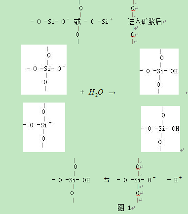 石英與長石都屬于架狀結(jié)構(gòu)硅酸鹽礦物,它們具有相同的晶體結(jié)構(gòu):硅(鋁)氧四面體與4個硅氧四面體共角頂相互聯(lián)結(jié),形成在三維空間無限延伸的架狀結(jié)構(gòu)。兩者在水溶液中的荷電機理也基本相同:礦物經(jīng)破碎后,晶體破裂,硅(鋁)氧鍵斷裂,在水溶液中吸附定位離子,生成羥基表面,在不同介質(zhì)pH 值條件下,產(chǎn)生解離或吸附,形成不同的表面電位。由于礦物破碎斷面上極化程度較高,親水性很強,所以石英和長石在很寬的pH 值范圍內(nèi)均呈現(xiàn)電負(fù)性,零電點都很低。由于長石結(jié)構(gòu)中,鋁氧四面體對硅氧四面體的取代,導(dǎo)致兩者在很多方面也有著細(xì)微的差別:Al3+與Si4+電價不同,為補償Al3+對Si4+的取代所造成的電價不平衡,而引進K+ 、Na+ 等堿土金屬離子,這些金屬離子與O2-之間的離子鍵鍵強低,聯(lián)結(jié)力弱,易在水中解離,使礦物表面留有荷負(fù)電的晶格,這使得通常情況下,長石的零電點比石英的低。同時由于Al—O鍵比Si-O鍵鍵強低,破碎時鍵更易于斷裂,使長石表面暴露大量Al3+化學(xué)活性區(qū)。這些差異導(dǎo)致石英長石的可浮性略有不同,為石英與長石的浮選分離提供了依據(jù)。