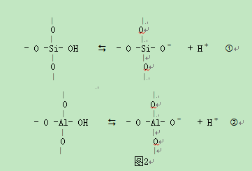 長石的解離表面除有Si-O鍵斷裂外,還有Al—O鍵斷裂,在礦漿體系中同時會有兩個平衡,見圖2。