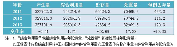 《年報》主要依據(jù)2013年中國環(huán)境統(tǒng)計年報及全國261個大中城市已經(jīng)發(fā)布的固體廢物污染防治信息匯總編制而成,分為全國大中城市固體廢物信息發(fā)布情況、全國固體廢物污染防治重點工作進展情況和能力建設情況3個部分,較為系統(tǒng)地介紹了當前我國固體廢物污染防治的相關情況。關于一般工業(yè)固廢產(chǎn)生及處理情況如下
