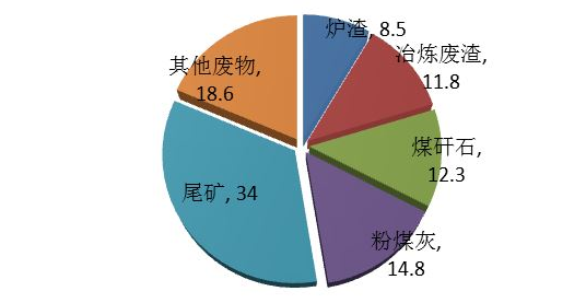 重點調(diào)查工業(yè)企業(yè)的一般工業(yè)固體廢物產(chǎn)生量為31.3億噸。其中,尾礦產(chǎn)生量為10.6億噸,占 34.0%,尾礦綜合利用量為3.3億噸,綜合利用率為30.7%;粉煤灰產(chǎn)生量4.6億噸,占14.8%,綜合利用量為4.0億噸,綜合利用率為86.2%;煤矸石產(chǎn)生量3.8億噸,占12.3%,綜合利用量為2.8億噸,綜合利用率為71.1%;冶煉廢渣產(chǎn)生量3.7億噸,占11.8%,綜合利用量為3.4億噸,綜合利用率為91.8%;爐渣產(chǎn)生量2.6億噸,占8.5%,綜合利用量為2.4億噸,綜合利用率為89.9%。