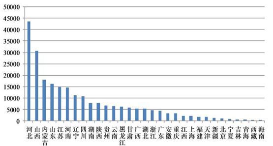 2013年,一般工業(yè)固體廢物產(chǎn)生量較大的省份為河北4.3億噸,占全國工業(yè)企業(yè)產(chǎn)生量的13.2%;山西3.1億噸,占全國工業(yè)企業(yè)產(chǎn)生量的9.3%;遼寧2.7億噸,占全國工業(yè)企業(yè)產(chǎn)生量的8.2%;內(nèi)蒙古2.0億噸,占全國工業(yè)企業(yè)產(chǎn)生量的6.1%;山東1.8億噸,占全國工業(yè)企業(yè)產(chǎn)生量的5.5%。