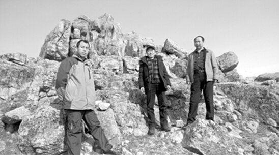 商都縣鑫垚鉀業(yè)公司董事長薛永庫(右)帶領(lǐng)馬鴻文(中)團隊成員考察商都鉀長石資源(劉昶江攝)