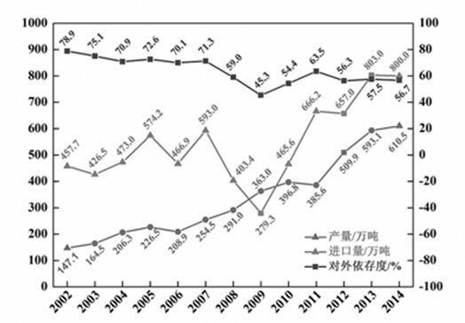 圖1 中國鉀肥的歷年產(chǎn)量、進口量和對外依存度