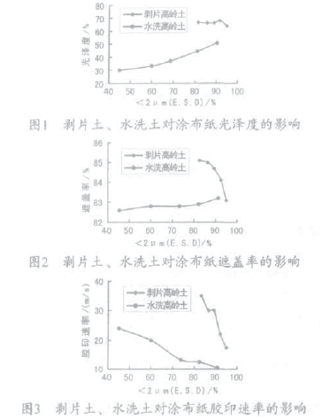 從圖1~3 中,我們不難看出:同等粒度條件下,剝片高嶺土在涂布紙的光澤度、遮蓋率以及膠印速率方面,都表現(xiàn)出比水洗高嶺土更加優(yōu)異的性能,是較理想的涂布造紙涂料產(chǎn)品,有著廣泛的應(yīng)用價值。
