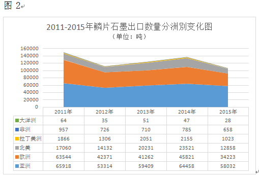 從圖中可以看出,亞洲、歐洲和北美市場一直是我國鱗片石墨出口的主要市場,三個市場占出口總量的98%以上。亞洲的數(shù)量始終保持第一,其次是歐洲,北美洲排第三。亞洲、歐洲、北美市場的數(shù)量逐漸下降,市場份額格局基本沒有變化 。