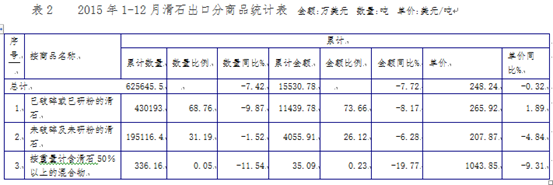 2015年我國(guó)出口的滑石主要來自遼寧省、廣西自治區(qū)、山東省,三地的出口數(shù)量比例約為70:25:5。廣西產(chǎn)滑石出口價(jià)格是最高的,高于330美元/噸,遼寧、山東產(chǎn)滑石在220美元/噸左右。
