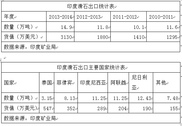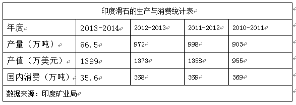 在2013到2014年財(cái)政年度,印度的滑石和皂石的產(chǎn)量是86.5萬(wàn)噸,同比下降了大約11%。RAJASTHAN當(dāng)?shù)氐幕a(chǎn)量占到了印度滑石生產(chǎn)總量的83%。