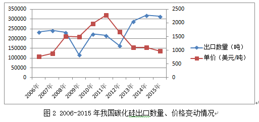 2015年,我國(guó)碳化硅出口總量31.5萬(wàn)噸,同比下降1.5%。出口總金額3.1億美元,同比下降,13.8%。出口均價(jià)970.2美元/噸,同比下降12.5%。