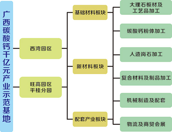 據(jù)了解,根據(jù)平桂碳酸鈣具有的資源優(yōu)勢(shì)、政策優(yōu)勢(shì)和后發(fā)優(yōu)勢(shì),科學(xué)地提出“12366”碳酸鈣產(chǎn)業(yè)發(fā)展思路:即圍繞打造廣西碳酸鈣千億元產(chǎn)業(yè)示范基地1個(gè)目標(biāo),規(guī)劃建設(shè)西灣、旺高2個(gè)園區(qū),大力發(fā)展基礎(chǔ)材料、新材料、配套產(chǎn)業(yè)3大板塊,涵蓋大理石板材及工藝品加工、碳酸鈣粉體加工、人造崗石、復(fù)合材料及制品生產(chǎn)、機(jī)械制造及配套和物流及商貿(mào)會(huì)展6大產(chǎn)業(yè),形成“大理石原料——大理石板材和工藝品——大理石邊角廢料回收——重質(zhì)碳酸鈣超細(xì)粉——合成人造大理石——新材料(涂料、塑料母粒、石頭紙等)”循環(huán)產(chǎn)業(yè)鏈,力爭(zhēng)2020年實(shí)現(xiàn)工業(yè)總產(chǎn)值600億元以上,成為廣西碳酸鈣千億元產(chǎn)業(yè)示范基地、全國(guó)最大的重質(zhì)碳酸鈣生產(chǎn)基地和最大的人造崗石生產(chǎn)基地。2015年廣西賀州旺高工業(yè)區(qū)(廣西碳酸鈣千億元產(chǎn)業(yè)示范基地)實(shí)現(xiàn)工業(yè)總產(chǎn)值139億元?,F(xiàn)有各類石材加工企業(yè)568家,其中規(guī)上企業(yè)35家, 中色集團(tuán)、中鋁集團(tuán)等多家央企入駐園區(qū),累計(jì)建成試(投)產(chǎn)崗石生產(chǎn)線44條。