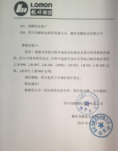 | 四川龍蟒和山東東佳鈦白粉今日發(fā)布漲價(jià)公告,奠定第七波漲潮 |
