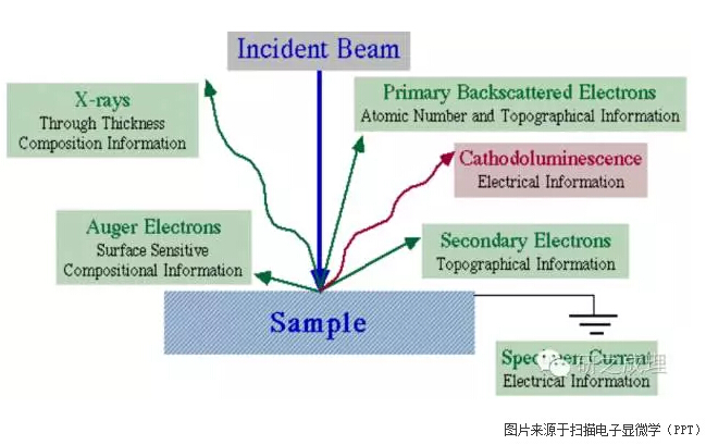 無論是SEM還是TEM,其主要目的都是成像。光與物體作用,使其呈現(xiàn)于人眼;在SEM/TEM中,電子取代光,與物體相互作用,使其呈現(xiàn)于屏幕。高速電子與樣品相互作用后發(fā)射出一系列的“電磁波”(如圖1)。