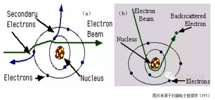 電子進入樣品后,一部分散射、一部分被吸收、還有一部分透射。被散射電子中,角度大而被散射回去的部分稱為背散射電子。這部分電子用于成像就叫背散射成像。背散射有分為兩大類:彈性背散射和非彈性背散射。彈性散射不損失能量,只改變方向。非彈性散射不僅改變方向,還損失能量,如圖5b所示。