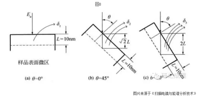 一張SEM圖中,通常會有些區(qū)域暗,有些區(qū)域亮。這些亮度的不同主要來自于兩類襯度:形貌襯度和成分襯度。如果是純物質(zhì)單組份樣品,其SEM圖中傾斜度比較大的側(cè)面會比較亮。以δ表示二次電子的產(chǎn)率,其與傾角成正相關(guān),如圖8所示。這種因為傾角不同而造成的明暗差異稱為形貌襯度。