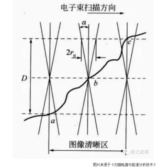 比較SEM圖和普通光學(xué)顯微照片或者TEM照片,會發(fā)現(xiàn)SEM圖看上去更具立體感。一個很重要的原因是SEM景深好。對于景深,有明確的定義和解釋,具體請參考《掃描電鏡工作原理和結(jié)構(gòu)》這本書(P24-26頁)。個人理解景深其實就是樣品在豎直方向的成像能力??梢耘c分辨率比較:粗略的認(rèn)為分辨率是在水平方向上的分辨能力。景深剛好與分辨率相對應(yīng),是豎直方向上的分辨能力(喜歡攝影和玩單反的朋友應(yīng)該對景深比較了解,請賜教)。圖10中b點為電子束匯聚點,a點和c點分別位于b點的上方和下方。圖中D即為景深。