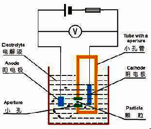圖中,小孔管浸泡在電解液中,小孔管內(nèi)外各有一個(gè)電極,電流通過孔管壁上的小圓孔從陽極流到陰極。小孔管內(nèi)部處于負(fù)壓狀態(tài),因此管外的液體將流動(dòng)到管內(nèi)。測量時(shí)將顆粒分散到液體中,顆粒就跟著液體一起流動(dòng)。當(dāng)其經(jīng)過小孔時(shí),小孔的橫截面積變小,兩電極之間的電阻增大,電壓升高,產(chǎn)生一個(gè)電壓脈沖。當(dāng)電源是恒流源時(shí),可以證明在一定的范圍內(nèi)脈沖的峰值正比于顆粒體積。儀器只要測出每一個(gè)脈沖的峰值,即可得出各顆粒的大小,統(tǒng)計(jì)出粒度的分布。