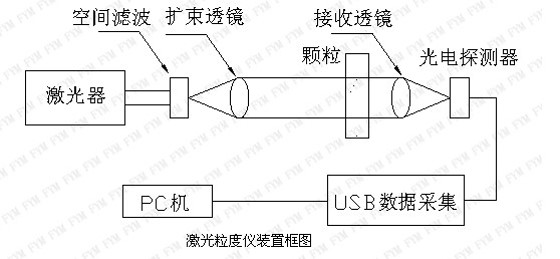 激光衍射顆粒粒度分析儀主要由激光器、擴(kuò)束鏡、聚焦透鏡、光電探測器和計(jì)算機(jī)組成,圖所示為激光衍射粒度分析儀的原理圖。在圖中,來自He-Ne激光器中的一束窄光束經(jīng)擴(kuò)束系統(tǒng)擴(kuò)束后,平行地照射在顆粒槽中的被測顆粒群上,由顆粒群產(chǎn)生的衍射光經(jīng)聚焦透鏡會(huì)聚后在其焦平面上形成衍射圖,利用位于焦平面上的一種特制的環(huán)形光電探測器進(jìn)行信號(hào)的光電變換,然后將來自光電檢測器中的信號(hào)放大、a/d變換、數(shù)據(jù)采集送入到計(jì)算機(jī)中,采用預(yù)先編制的優(yōu)化程序?qū)τ?jì)算值與實(shí)測值相比較,即可快速地反推出顆粒群的尺寸分布。請(qǐng)牢記:小顆粒的散射角大,大顆粒的散射角小。