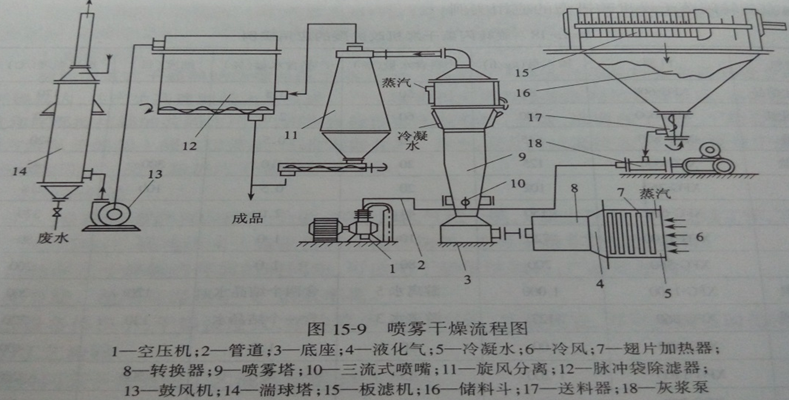 工作時(shí),干燥器的塔頂頂部導(dǎo)入熱風(fēng),同時(shí)用泵將料液送上塔頂并經(jīng)霧化器噴成霧狀的液滴群,液滴群的比表面積很大,當(dāng)它與高溫?zé)犸L(fēng)接觸后水分迅速蒸發(fā),在極短的時(shí)間內(nèi)成為干燥產(chǎn)品,產(chǎn)品由塔底排除。熱風(fēng)經(jīng)傳熱后溫度顯著下降、濕度增大、由廢氣口排除,廢氣中夾帶的產(chǎn)品顆粒用固氣分離裝置回收。