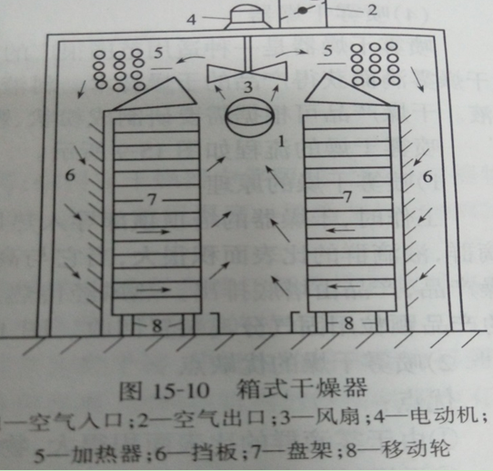 箱式干燥機(jī)主要是以熱風(fēng)通過(guò)物料的表面而達(dá)到干燥的目的。它為間歇式操作,適用于干燥時(shí)間較長(zhǎng)和數(shù)量不多的物料。通常物料裝盤(pán)用人工放入干燥器支架上,或置于小推車上送入箱內(nèi)。物料的厚度為10~100nm,熱空氣的流速為0.5~10m/s。箱式干燥機(jī)結(jié)構(gòu)如圖3所示。