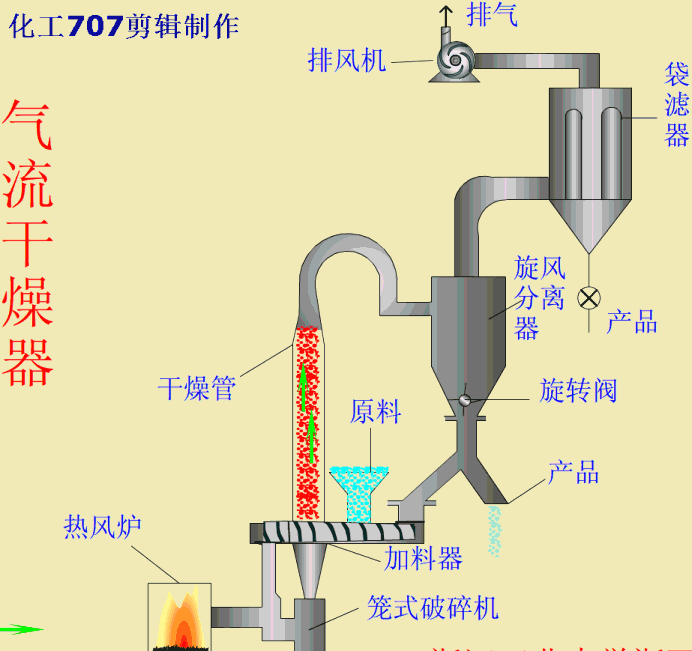 其缺點(diǎn)是對(duì)不耐高溫的物料體積傳熱系數(shù)低,所需干燥器的容積大;單位產(chǎn)品耗熱量大及動(dòng)力消耗大。另外,對(duì)細(xì)粉粒產(chǎn)品需高效分離裝置。