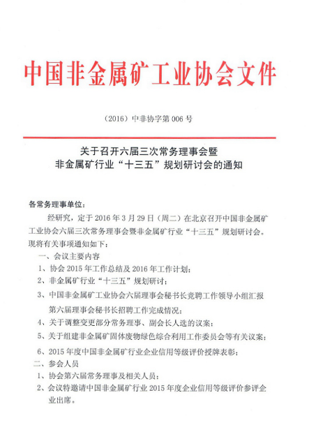 【北京】中國(guó)非金屬礦工業(yè)協(xié)會(huì)六屆三次常務(wù)理事會(huì)暨非金屬礦行業(yè)“十三五”規(guī)則研討會(huì)會(huì)議通知