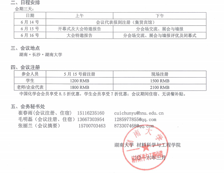 “2016中國(guó)(國(guó)際)能源材料化學(xué)研討會(huì)”由湖南大學(xué)馬建民、清華大學(xué)張強(qiáng)、中國(guó)科學(xué)技術(shù)大學(xué)余彥、北京大學(xué)郭少軍、臥龍崗大學(xué)郭再萍及南洋理工大學(xué)范紅金等學(xué)者組織發(fā)起,得到中科院沈陽(yáng)金屬所成會(huì)明、廈門大學(xué)孫世剛、中國(guó)科學(xué)技術(shù)大學(xué)謝毅、湖南大學(xué)俞汝勤及臥龍崗大學(xué)竇世學(xué)和劉華坤等院士支持。此次研討會(huì)由中國(guó)化學(xué)會(huì)主辦,湖南大學(xué)承辦,定于2016年 6 月14 —16日在湖南大學(xué)集賢賓館舉行。