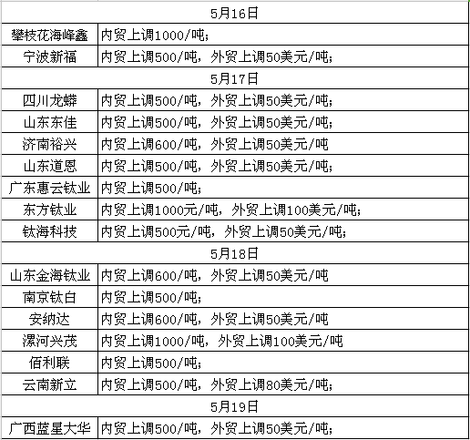 上周國內鈦白粉生產企業(yè)調價信息統(tǒng)計