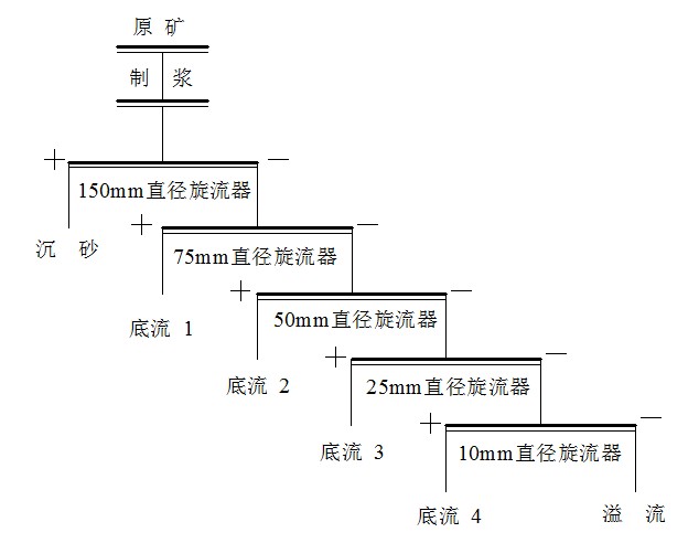 實驗方案:采用旋流器型號為GSD150(150mm)、GSD75(75mm)、GSD50(50mm)、GSD25(25mm)、GSD10(10mm)。五個旋流器串聯(lián),進行選礦提純實驗,旋流器分選工藝流程圖見圖1