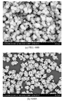 (1) 聚乙二醇600 對(duì)碳酸鈣有很好的防團(tuán)聚作用,制得的產(chǎn)品為形貌均一的球形碳酸鈣。