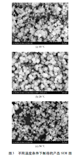 當(dāng)氯化鈣濃度為0.4 mol·L-1,碳酸銨溶液滴加速度為20 mL·min-1,攪拌速度為高速,聚乙二醇與氯化鈣摩爾比為0.01∶1 的條件下,考察了反應(yīng)溫度分別為10 ℃,20 ℃,50 ℃ 條件下對(duì)碳酸鈣分散性及形貌的影響。電鏡掃描結(jié)果見(jiàn)圖3。實(shí)驗(yàn)結(jié)果表明20 ℃條件下制得的碳酸鈣分散效果最理想。這是因?yàn)榉磻?yīng)溫度升高使得碳酸鈣晶體的成核速率加快,晶體快速生長(zhǎng),極易聚集形成大顆粒晶體。溫度過(guò)低不利于形成形貌均一的碳酸鈣產(chǎn)品。因此,本實(shí)驗(yàn)確定最佳反應(yīng)溫度為20 ℃。