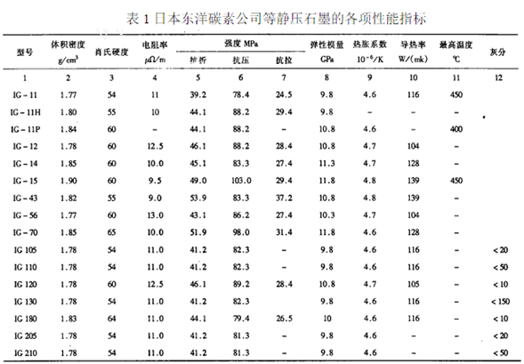 石墨化后,還需要對(duì)制品的密度、硬度、強(qiáng)度、電阻率、灰分等指標(biāo)進(jìn)行檢查,以判斷是否達(dá)到指標(biāo)要求。表1為日本東洋碳素公司等靜壓石墨的各項(xiàng)性能指標(biāo)。 表1日本東洋碳素公司等靜壓石墨的各項(xiàng)性能指標(biāo)