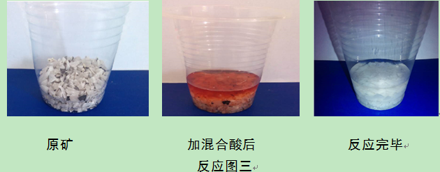 3、浸泡過(guò)程,把石英礦顆粒、砂或粉放入塑料容器,把混合酸加入裝石英的容器內(nèi),浸泡沒(méi)過(guò)物料為準(zhǔn)。見(jiàn)反應(yīng)過(guò)程圖三。