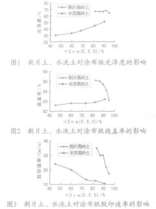 剝片高嶺土與水洗高嶺土涂布紙其他物理性能 比較,見圖 1~3。