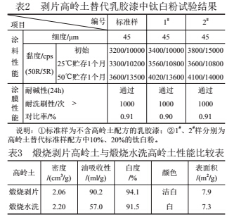 煅燒剝片土與水洗高嶺土在涂料上應(yīng)用,也有 著較明顯的差別,物理性能比較的結(jié)果,見表 3。