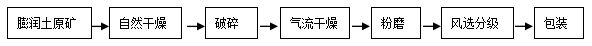 干法提純即采用風(fēng)選,是近年來普遍采用的膨潤土提純方法。風(fēng)選的一般要求是入料含蒙脫石達(dá)80%以上。先將礦石存放在料場上自然干燥,使其中水分降至25%以下,然后進(jìn)行粗碎至產(chǎn)品粒度達(dá)到30~40mm,并在250℃以下的溫度進(jìn)一步烘干,一般用氣流干燥和流態(tài)化干燥,時間不易過長,使水分降到10%以下。最后對烘干的礦石進(jìn)行粉磨、分級、包裝。具體風(fēng)選的原則流程如下圖。