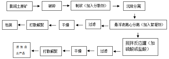 濕法酸活化中,酸液可以循環(huán)使用,并與熱活化共同作用,這樣既達(dá)到了更好的活化效果,也節(jié)約了生產(chǎn)成本。主要的工藝流程如下圖。