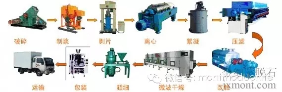 蒙脫石濕法提純技術:通過粗選、分級、制漿、剝片、離心、去重金屬、絮凝、壓濾、干燥、微波、粉碎等多道復雜工藝,能把蒙脫石含量按要求穩(wěn)定控制在95%以上的技術,是真正的提純技術。網(wǎng)上有個圖,我引用一下,粗略可以表達提純的思想,但提純是個技術活,是有靈魂的,你照搬也不會成功的。有的人照搬也就是“水洗”,往往洗出來還沒扔掉的純,“一個礦山一種工藝”這個提法是科學的。