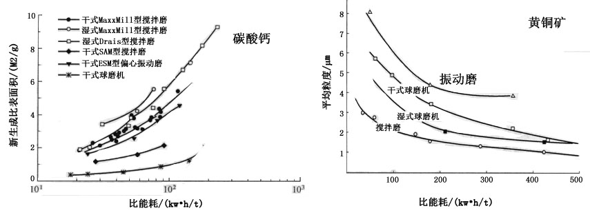 四、比較攪拌磨與其他磨機(jī)獲得產(chǎn)品細(xì)度與所需能耗的關(guān)系