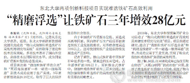 2008年,東北大學和鞍鋼集團礦業(yè)公司啟動了“鞍山式微細粒難選鐵礦高效利用關鍵技術研究與實踐”項目。項目組通過研究,提出了“微細粒鐵礦石浮選分離”和“兩段連續(xù)磨礦—單一磁選—細篩再磨”技術,并成功應用于工業(yè)實踐,實現了鞍山式微細粒難選鐵礦資源的高效利用。