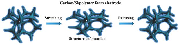 為了制備具有高容量的可伸展收縮的鋰離子電池柔性負極,斯坦福大學崔屹教授課題組通過化學氣 相沉積(CVD)法先制備出負載有高容量晶體硅的碳骨架負極,再通過聚合反應在骨架表面包覆一層具有高彈性的聚合物以大大提高電極的機械應變性能。結果發(fā)現(xiàn),當涂覆了聚合物后,盡管電極阻抗有一定程度的增大,但是沒有大大限制硅碳復合負極的容量發(fā)揮,以100mA/g的電流密度恒流充放電測試,涂覆質(zhì)量分數(shù)為2%的柔性電極循環(huán)100次克容量仍有722mAh/g,能量密度遠遠高于先前報道的Li4Ti5O12@PDMS柔性負極。由于涂覆有高彈性聚合物,該電極具有良好的彈性應變性能和自我修復功能,最大可以承受400%的形變,在25%的形變量內(nèi)做拉伸-釋放實驗,可以達到1000次循環(huán)后無損害。該電極有望應用于未來高比能量的柔性鋰離子電池的負極上。