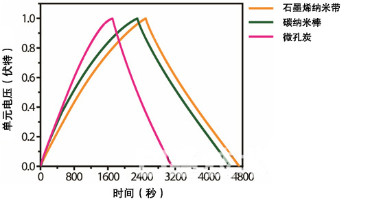 以試制的碳納米棒和石墨烯納米帶,以及通常使用的微孔炭作為電極材料的電容器的恒定電流充放電特性