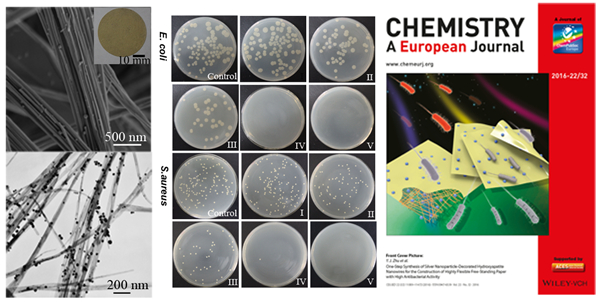 抗菌耐火紙由于其高效抗菌功能具有良好的應(yīng)用前景。紙和紙制品是人們生活和工作中不可缺少的用品,一些使用和交換頻繁的紙張,例如病歷紙、鈔票紙和各種票據(jù)等,細(xì)菌容易附著于紙的表面并通過人群傳播,對人體健康造成嚴(yán)重威脅。另外,重要館藏書籍和文物的保存也需要預(yù)防霉菌。因此,研制新型抗菌無機耐火紙具有重要的研究意義和實用價值。最近,朱英杰團(tuán)隊發(fā)展了新型抗菌羥基磷灰石耐火紙的制備技術(shù),通過一步溶劑熱法制備出分散性好、含量可調(diào)控的納米銀復(fù)合羥基磷灰石超長納米線,并成功制備出尺寸和厚度可調(diào)控的新型抗菌羥基磷灰石耐火紙,該紙具有高柔韌性、良好的生物相容性和高效抗菌性能,并且不燃燒和耐高溫。相關(guān)研究結(jié)果受到審稿人的高度評價,作為封面論文和熱點論文(Hot Paper)發(fā)表在《歐洲化學(xué)》上 (Xiong et al., Chemistry-A European Journal, 22, 11224-11231 (2016)) (如圖)。該論文發(fā)表后不久,7月17日ChemistryViews 以Nanowire Paper with Antibacterial Activity 為題對新型抗菌無機耐火紙的研究工作做了亮點報道。隨后8月1日,《化學(xué)工程》(Chemical Engineering)期刊以This paper has antibacterial activity 為題對該研究工作也做了亮點報道。