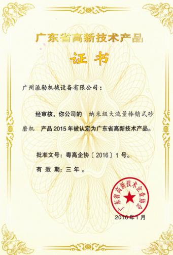 廣東派勒智能納米科技股份有限公司近期拿到了廣東省高新技術(shù)企業(yè)協(xié)會頒發(fā)的廣東省高新技術(shù)產(chǎn)品證書,公司的"納米級大流量棒銷式砂磨機”以及“全尺寸動態(tài)分離納米研磨機"2015年被認定為“廣東省高新技術(shù)產(chǎn)品”。該認定有效期:三年;批準文號:粵高企協(xié)【2016】1號。