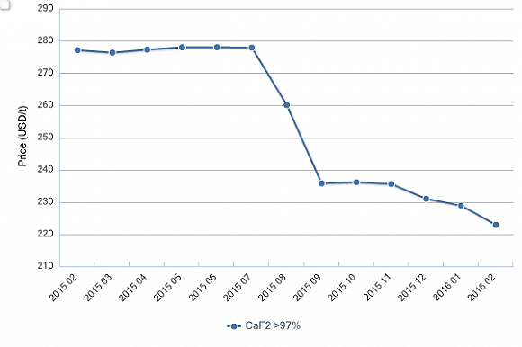 圖1:中國螢石粉(CaF2>97%)月度平均出廠價,2015年2月–2016年2月