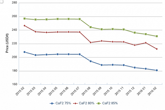 圖2:中國螢石塊礦(CaF2 75%, 80% and 85%)月度平均出廠價,2015年2月–2016年2月